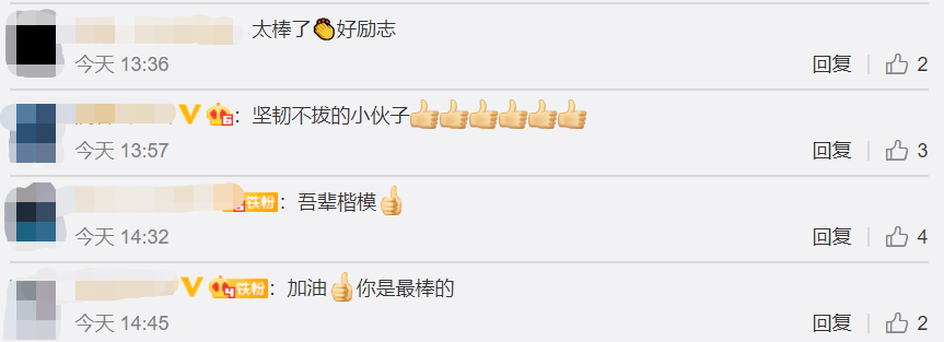 “太棒了 ,好励志”“加油,你是我们的榜样”“有梦想的人都了不起”
