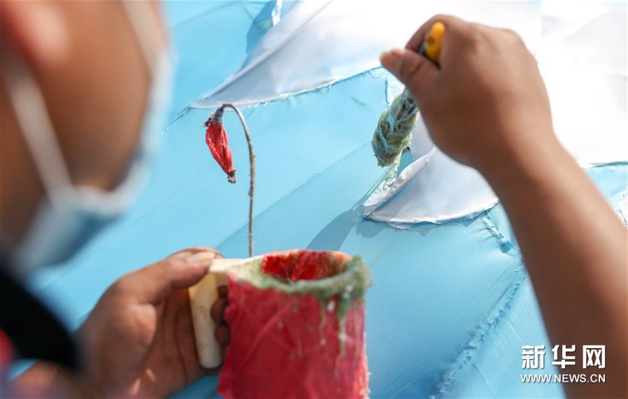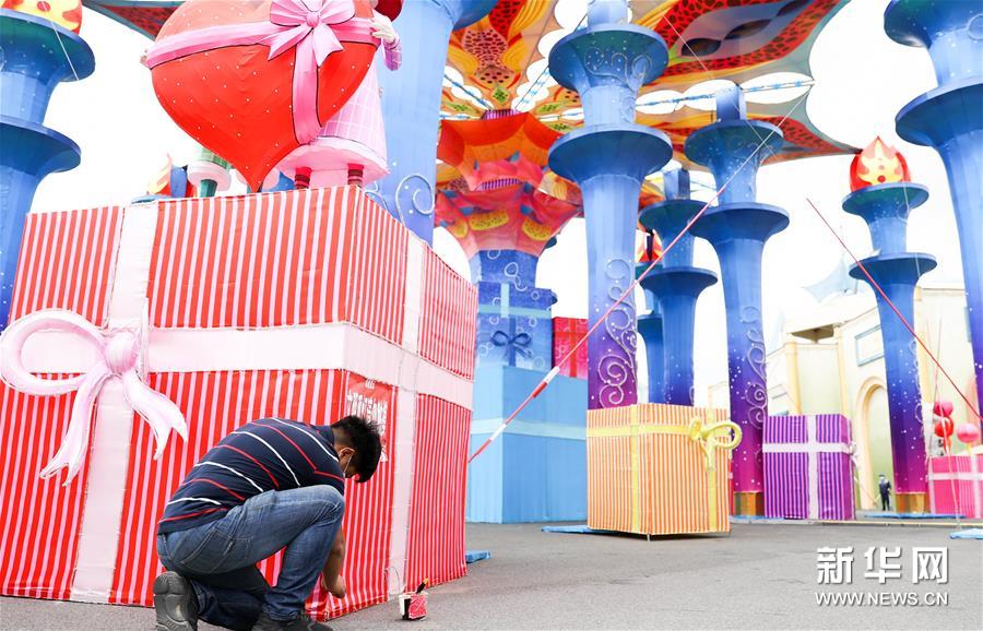 6月27日,江成财在长春市长影世纪城内修补破损的彩灯。新华社发(颜麟蕴摄)