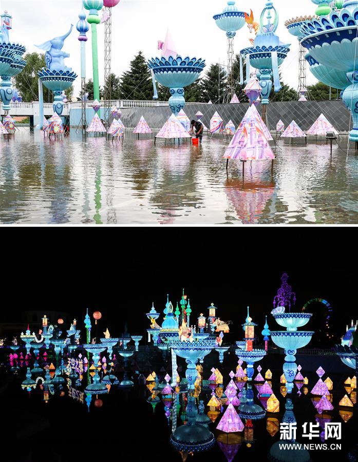 拼版照片:上图为江成财在长春市长影世纪城内安装彩灯内的技术装置(6月27日摄);下图为6月26日拍摄的长春市长影世纪城大型彩灯。新华社发(颜麟蕴摄)