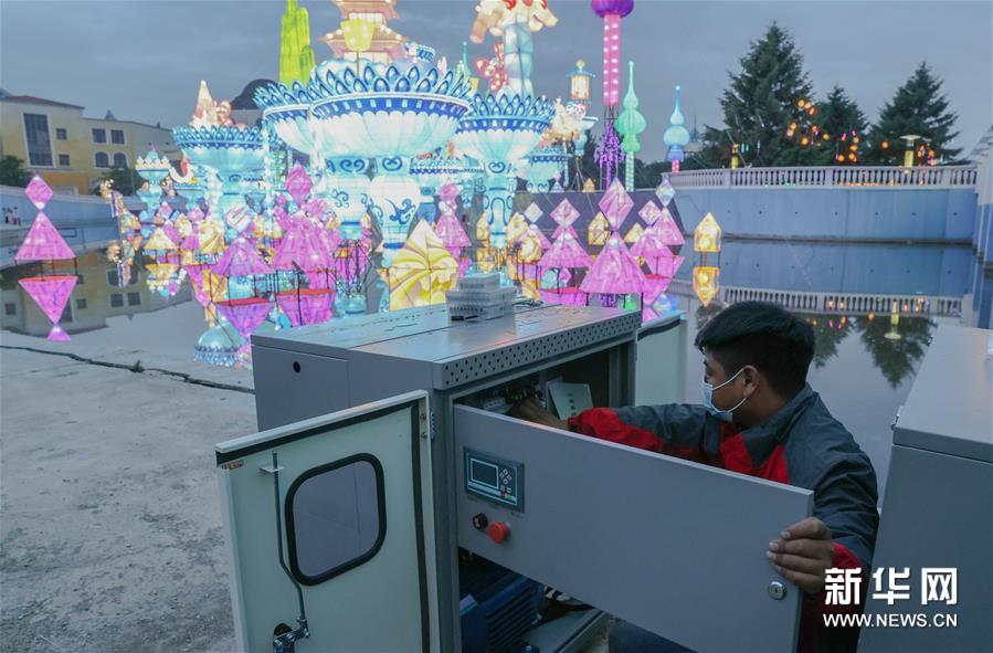 6月26日,江成财为长春市长影世纪城内的大型彩灯组调试电压。新华社发(颜麟蕴摄)