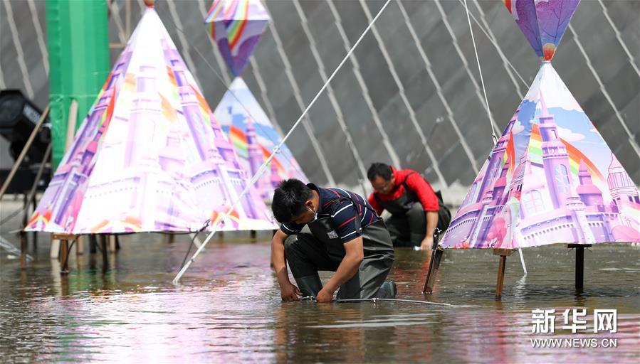 6月27日,江成财(前)在长春市长影世纪城内安装彩灯内的技术装置。新华社发(颜麟蕴摄)