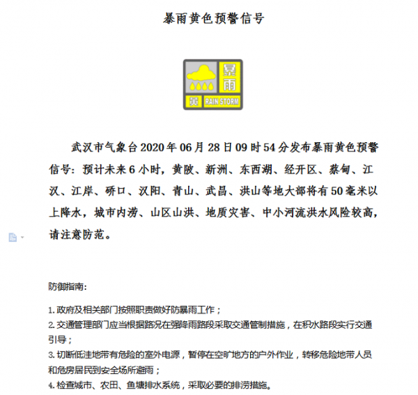 武汉市气象台9时54分发布暴雨黄色预警,预计未来6小时,黄陂、新洲、东西湖、经开区、蔡甸、江汉、江岸、硚口、汉阳、青山、武昌、洪山等地大部将有50毫米以上降水,城市内涝、山区山洪、地质灾害、中小河流洪水风险较高,请注意防范。