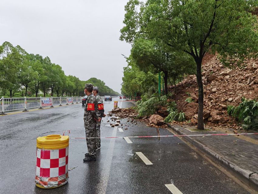 曾都城南新区白云大道:白云大道白舜井大桥段有山体塌方,前进社区安排人员值守