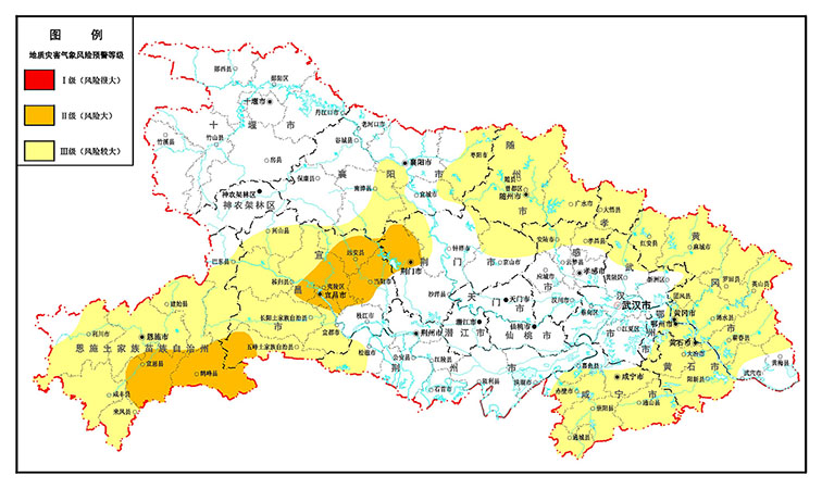 荆楚网客户端一荆楚网消息(记者徐蕾 通讯员 杜琦)6月28日,湖北省自然资源厅发布最新一期地质灾害气象风险预警:2020年6月28日20时-6月29日20时,预计三峡库区、宜昌地区、恩施地区、随州地区、黄冈地区、鄂州市、黄石地区、咸宁地区,襄阳(襄城区、南漳、宜城、枣阳)、荆门(钟祥西北部、京山北部)、荆州(松滋)、孝感(安陆、孝昌、大悟)、武汉(黄陂北部、新洲东北部)以及其他暴雨中心发生崩塌、滑坡、泥石流的风险较大(Ⅲ级),请相关地方政府及有关部门做好地质灾害防范工作;其中,宜昌(宜昌市城区、夷陵东部、远安、当阳、五峰西部)、恩施(宣恩、鹤峰)、荆门(荆门市城区)发生崩塌、滑坡、泥石流的风险大(Ⅱ级),请相关地方政府及有关部门加强地质灾害防范,做好应急准备工作。