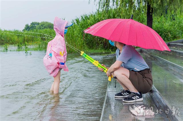 6月28日下午,在武汉汉口江滩,江水上涨已经淹没江滩一级亲水平台,市民亲水嬉戏。受持续降雨影响,我省江河湖库水位快速上涨,6月28日11时,我省正式启动水旱灾害防御IV级应急响应。截至28日18时,汉口武汉关水位达24.27米,逼近25米设防水位。(湖北日报全媒记者 梅涛 摄)