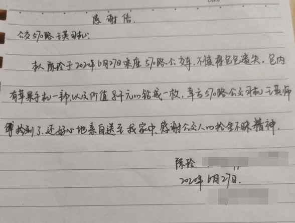 13时许,王英通过陈女士提供的家庭住址,从武昌火车站东广场出发,驾驶私家车行驶7.5公里,将手提包送到了陈女士家中。陈女士手写一封感谢信送给王英:“真的太感谢你了,要不是你及时帮我找回手提包,我可真不知道怎么办!”(见习记者范佳昕 通讯员杨勇攀 陈祺民)