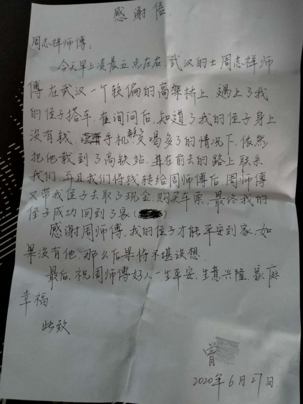 小伙子家人手写了一封感谢信,拍照发给周师傅,以示感激。 通讯员彭婧 供图