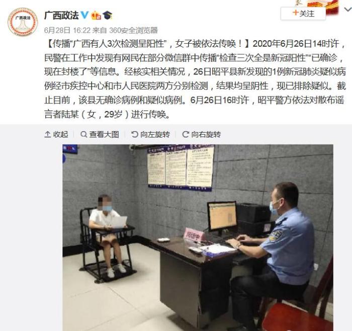 中新网6月29日电 28日,广西壮族自治区党委政法委官方微博发布通报称,2020年6月26日14时许,民警在工作中发现有网民在部分微信群中传播“检查三次全是新冠阳性”“已确诊,现在封楼了”等信息。经核实相关情况,26日昭平县新发现的1例新冠肺炎疑似病例经市疾控中心和市人民医院两方分别检测,结果均呈阴性,现已排除疑似。