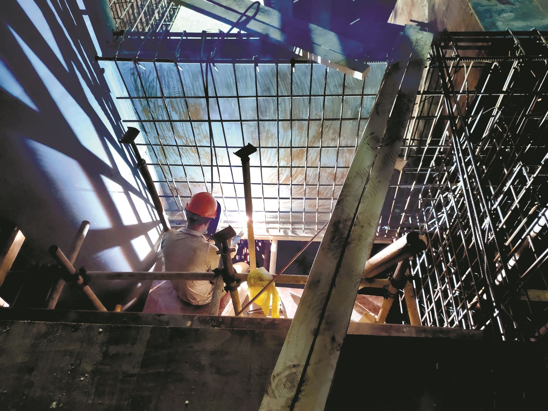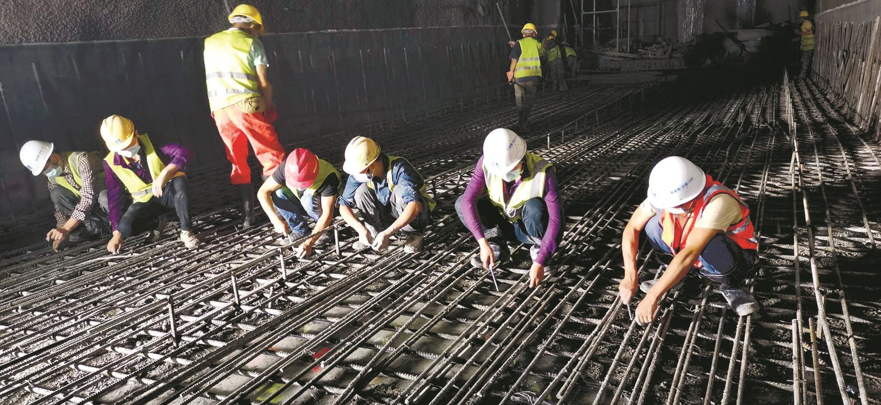 地下37米深处,工人们一字排开彻夜绑扎钢筋,挥汗如雨,追赶工期;