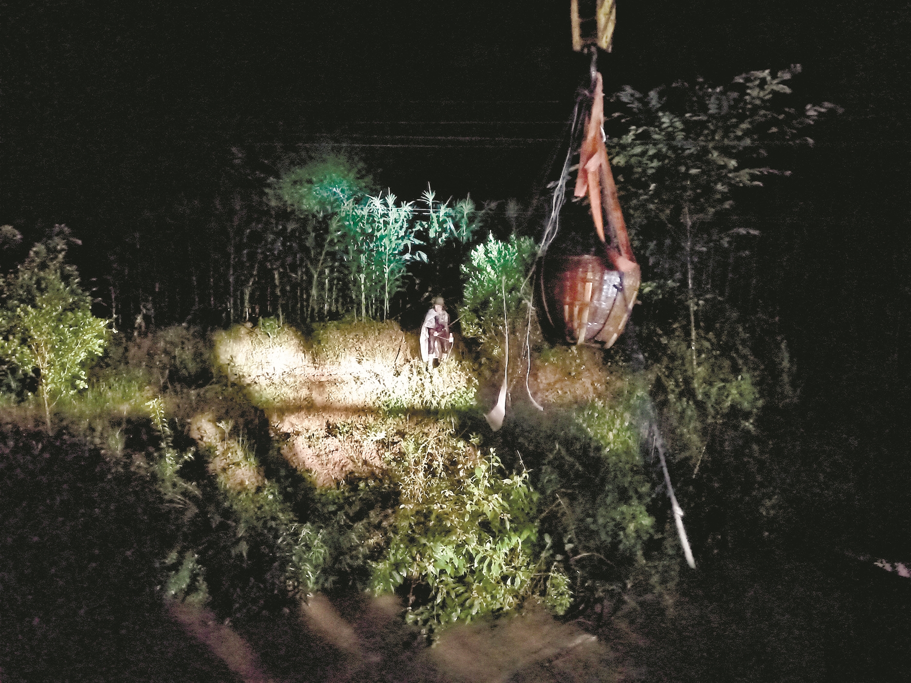 暴雨还在下着,山中漆黑一片。民警和村民用手电筒和手机照亮,看到周婆婆身上披着一片塑料薄膜挡雨,在河对岸焦急徘徊,身体瑟瑟发抖。河面宽10余米,水流急促,在没有保护措施的情况下,无人敢冒险下水,即使勉强过了河,也无法将周婆婆背过来。消防救援人员还在路上,情况紧急,民警商量后决定,尝试用派出所的拖车救援。