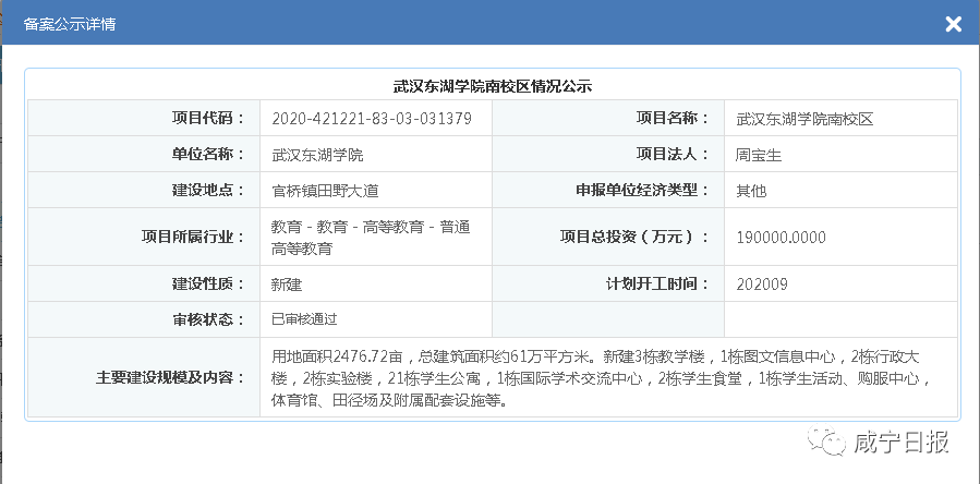 6月28日,记者从湖北政务服务网获悉,武汉东湖学院南校区项目已获得批复。公示显示:武汉东湖学院南校区计划于今年9月开工建设。