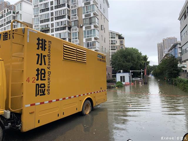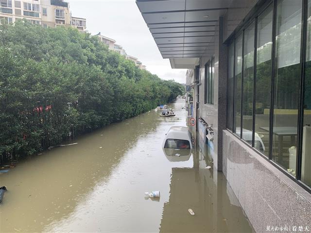 今天上午11时40分,记者来到洪山区雄楚大道尚文路路口,多名民警正在此处执勤,指挥交通,两辆排水抢险车正在作业排水。尚文路和尚文创业城小区全部被淹,停在尚文路上的一辆面包车,积水已经达到车窗玻璃处。塑料垃圾桶和生活垃圾漂浮在水面。外卖小哥到了路口,无法通行,只能绕道。