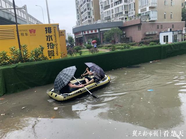记者采访时,水面上,有两人撑着雨伞,坐在皮划艇内,划向雄楚大道。到达浅水处路口,其中一位金先生光着脚从皮划艇中下来,他穿好鞋袜,准备去上班。另外一位市民则划艇原路返回。