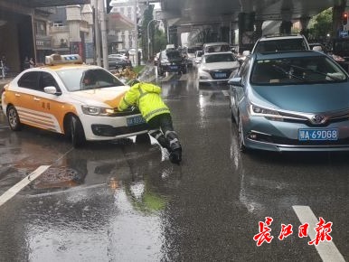 雄楚大道出租车故障,武昌汉警快骑“斗牛”推车。通讯员高梓健 摄