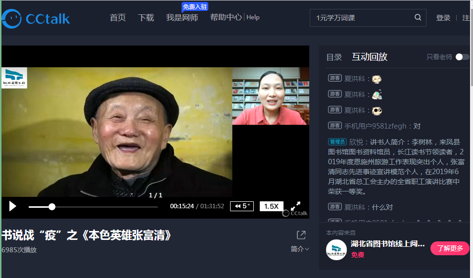 什么是信仰?信仰的力量有多大?6月27日,长江读书节“书说战‘疫’”之《本色英雄张富清》活动在CCtalk平台直播,长江读书节领读者、恩施州来凤县图书馆图书资料馆员李树林通过讲述老兵张富清六十多年深藏功名、一辈子坚守初心、不改本色的英雄事迹,与线上线下的读者朋友们一起重温信仰的力量,接受了一次信仰教育,一次灵魂洗礼。