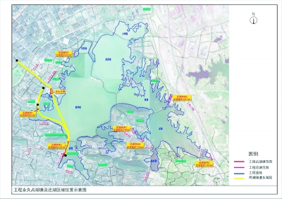 两湖隧道工程永久占湖塘及还湖区域位置示意图。