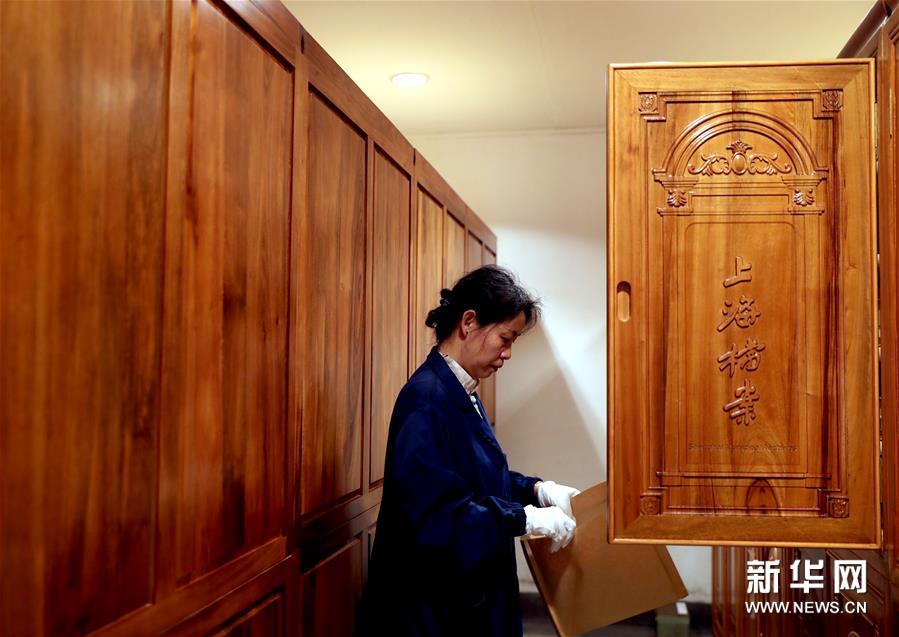 6月29日,上海市档案馆档案保管部的工作人员在档案库里提取档案。新华社记者 刘颖 摄