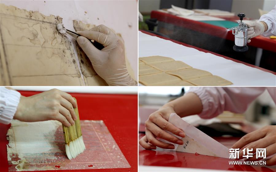 这张拼版照片展示的在上海市档案馆保护技术部拍摄的档案修复部分工序环节:除尘除霉(左上)、去酸(右上)、加固(左下)、加固完成(右下)(图片均为6月29日拍摄)。新华社记者 刘颖 摄
