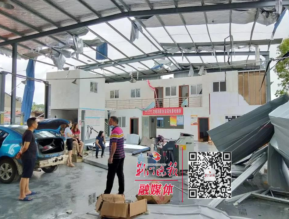 大量工棚受损严重,数十棵行道树连根拔起,工棚吹落的铁皮扭曲变形。