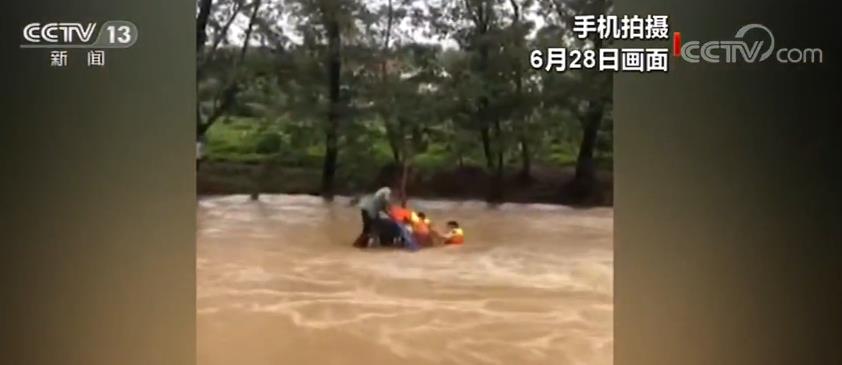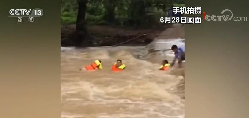 这段手机视频拍摄于28日下午。视频中,我们可以看到一辆三轮车被困在河中,一位50多岁的男子站在车架上,当地派出所接警后立即赶往现场救援,由于水较深,民警带着救生衣和救援绳索游向被困人员,并将绳索系在三轮车上,为被困人员穿上救生衣。