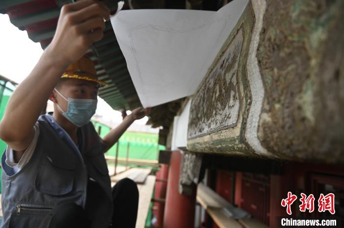 刘巧辰说,“过谱子”是古建筑彩画重绘时的必要工艺,通过“过谱子”可不改变文物的原状,这也是古建筑修缮的第一个原则。
