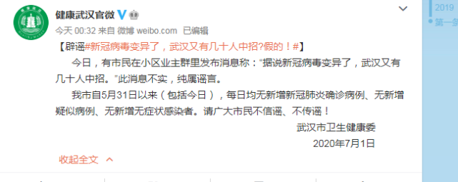 今日,有市民在小区业主群里发布消息称:“据说新冠病毒变异了,武汉又有几十人中招。”此消息不实,纯属谣言。