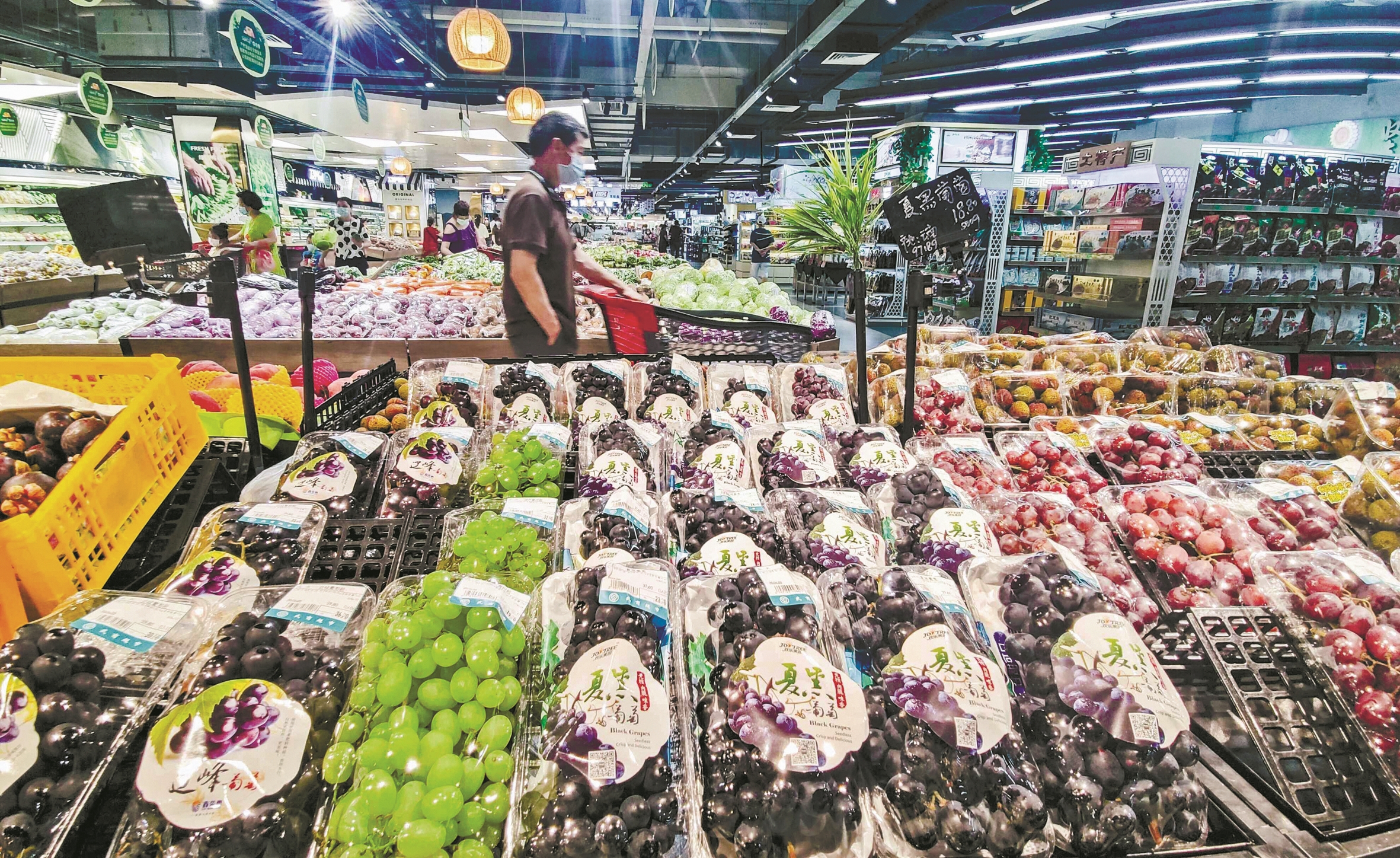 在本地葡萄专卖区里,夏黑葡萄6.9元一斤,冰糖葡萄、乒乓球葡萄5.8元一斤,黑玫瑰6.8元一斤,相较进口葡萄均便宜2元,现场有不少市民选购。