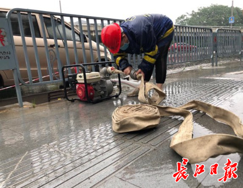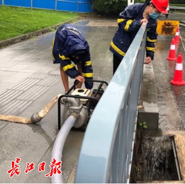 长江网7月2日讯7月2日,一场暴雨如期而至,在汉口常靑立交桥下低洼处值守的江汉区水务人员观察到下水管道有滞排现象,立刻启动移动排水泵抽排,保障道路畅通。(记者刘斌 摄影报道)