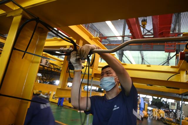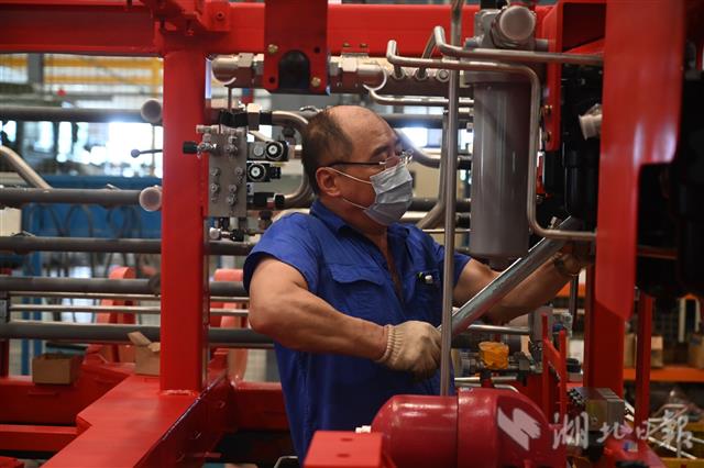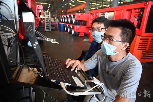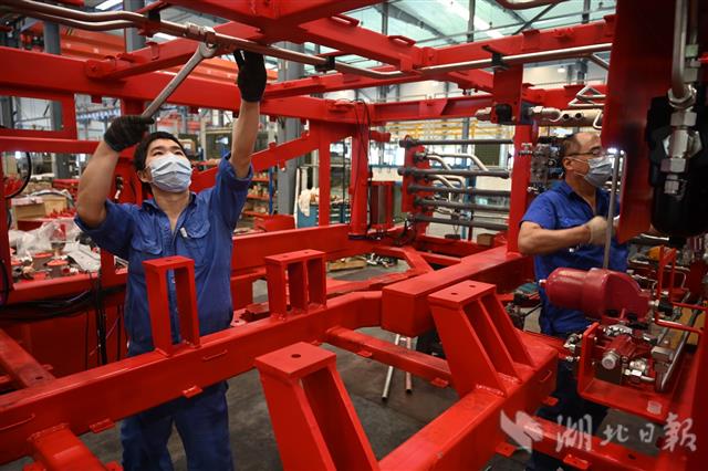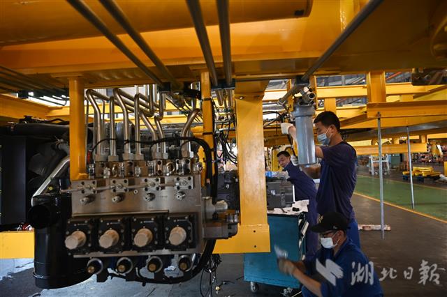 6月30日,在航天三江万山公司产业园现场,几位装配工人正在抢装自行式模块运输车动力头。全面复工复产之后,公司全员进入“战时”状态,节假无休,开足马力,克服解决供应商延迟开工、外购件物流发货受限等不利因素,抓好多方协调及资源统筹,确保按用户要求完成产品装配下线。WTW380B型平板运输车已按时交付使用。(湖北日报全媒记者 刘曙松 通讯员 谭青海 摄)