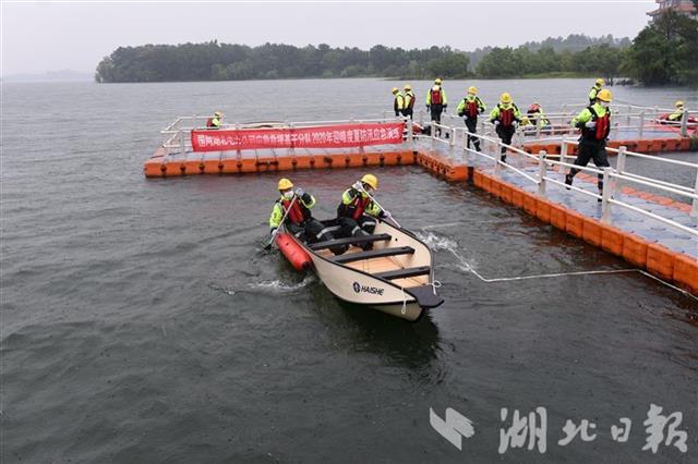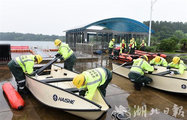 湖北日报讯(通讯员邹小民)7月2日,在武汉市黄陂区木兰湖实训基地。国网湖北电力应急救援基干分队30名多名队员雨中开展防汛应急演练。