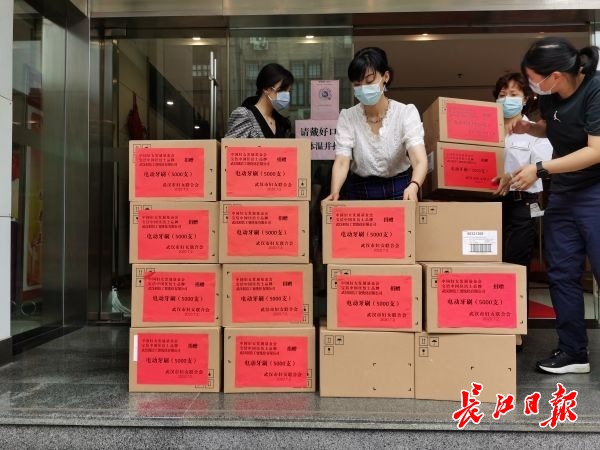 市妇联工作人员正在搬运电动牙刷。记者朱佳琦 摄