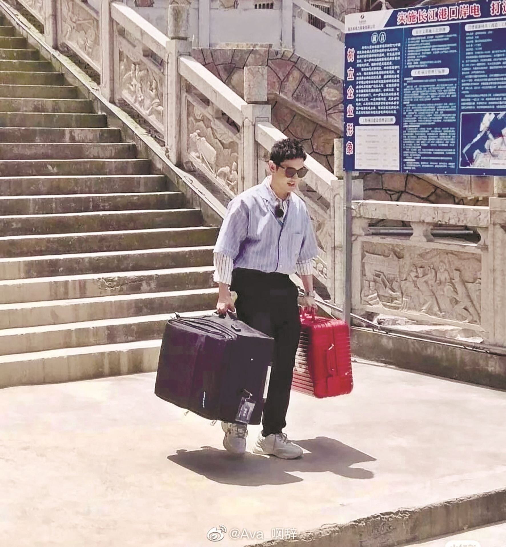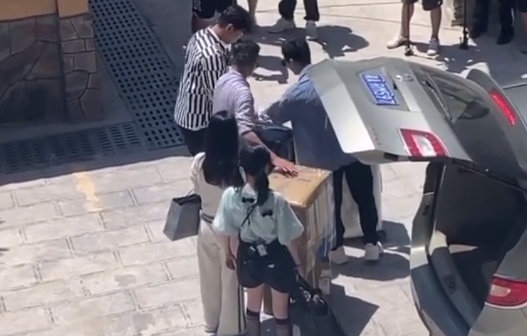 网友路透图中搬箱子下台阶的黄晓明