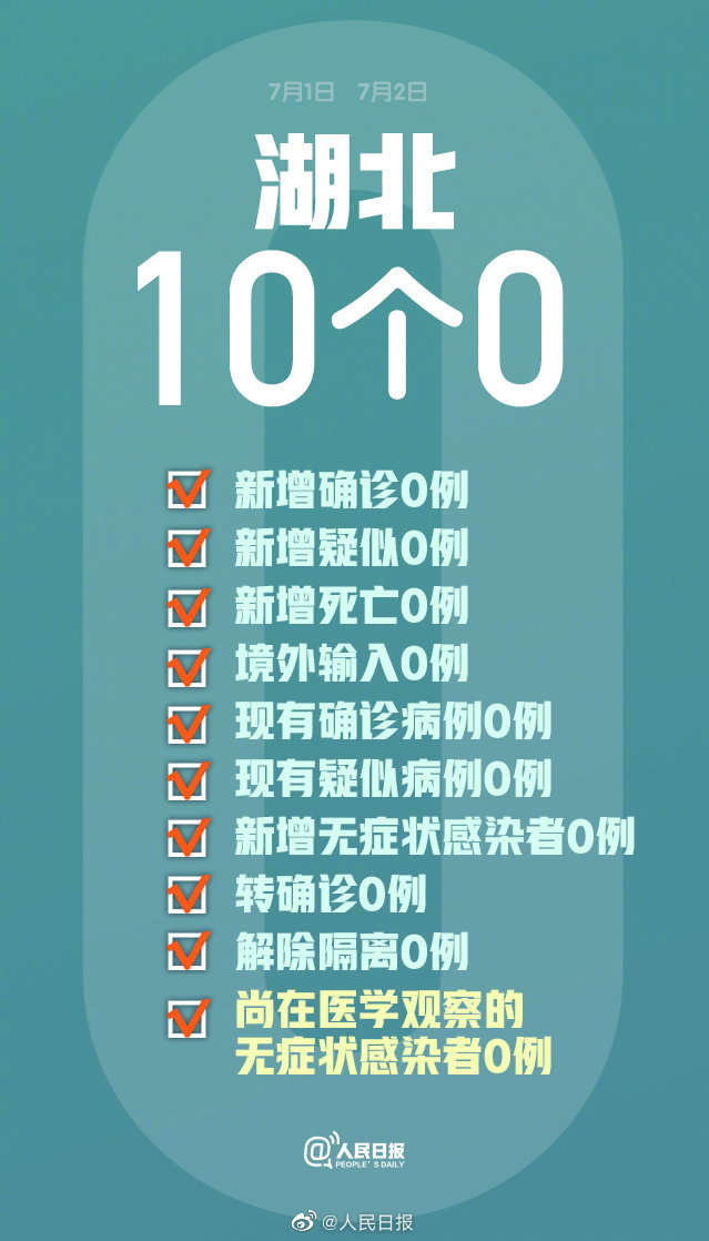 7月1日-7月2日,湖北连续两天通报10个“0”:新增确诊0例,新增疑似0例,新增死亡0例,无境外输入病例;现有确诊病例0例,现有疑似病例0例;新增无症状感染者0例,转确诊0例,解除隔离0例,尚在医学观察的无症状感染者0例。每一次清零都来之不易,疫情防控常态化,继续坚持!