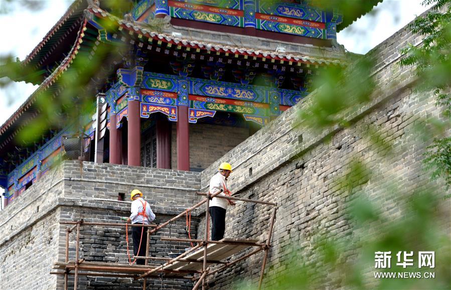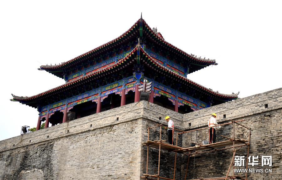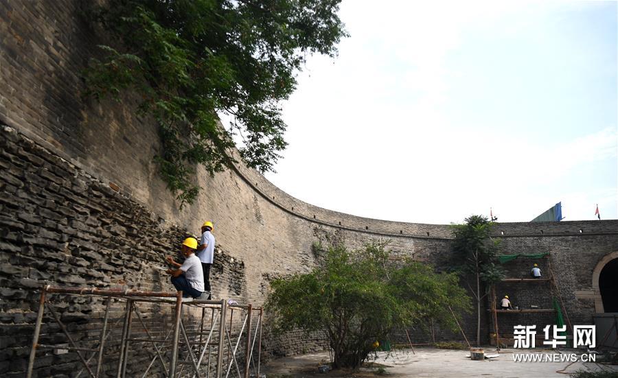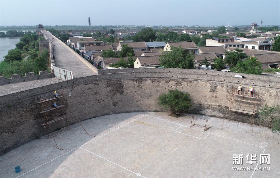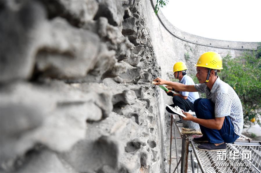 7月2日,工作人员在永年广府古城修缮城墙。新华社记者 王晓 摄