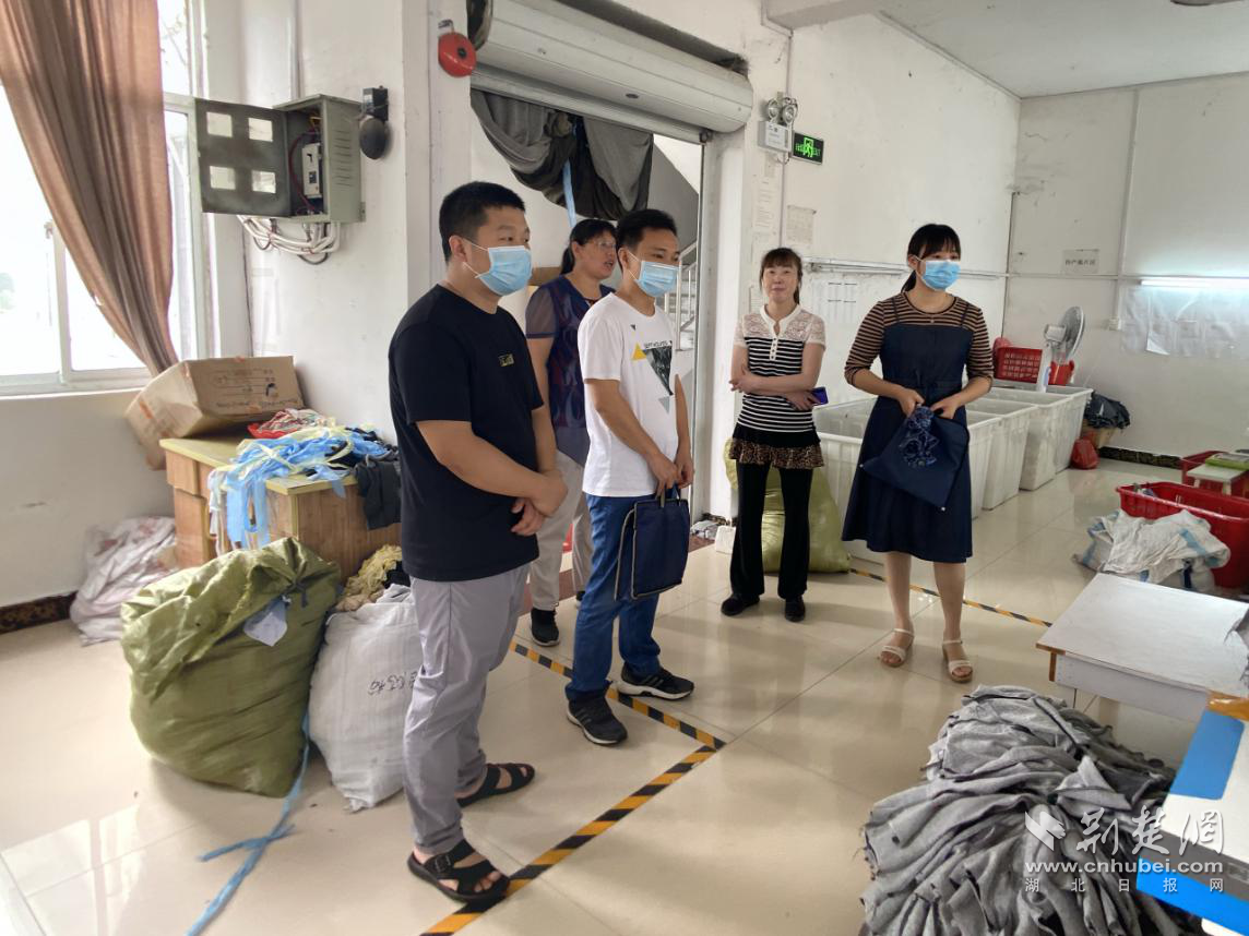 图为:认定组查看辉煌达制衣厂运转情况。通讯员 供图