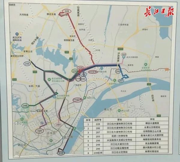 298路:首末站由兴龙路恒大龙城公交场站至梅墩街地铁高车站,线路走向为:兴龙路、庆云路、巨龙大道、汉口北大道、梅教街。单程线长22公里,配车44台。线路是连接盘龙城组团和汉口北的主要干线。