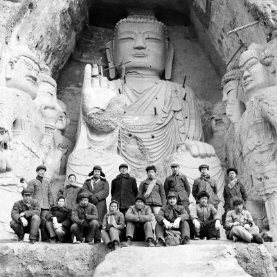 1959年,常书鸿和敦煌文物研究所的同事在天梯山石窟第13窟前合影。