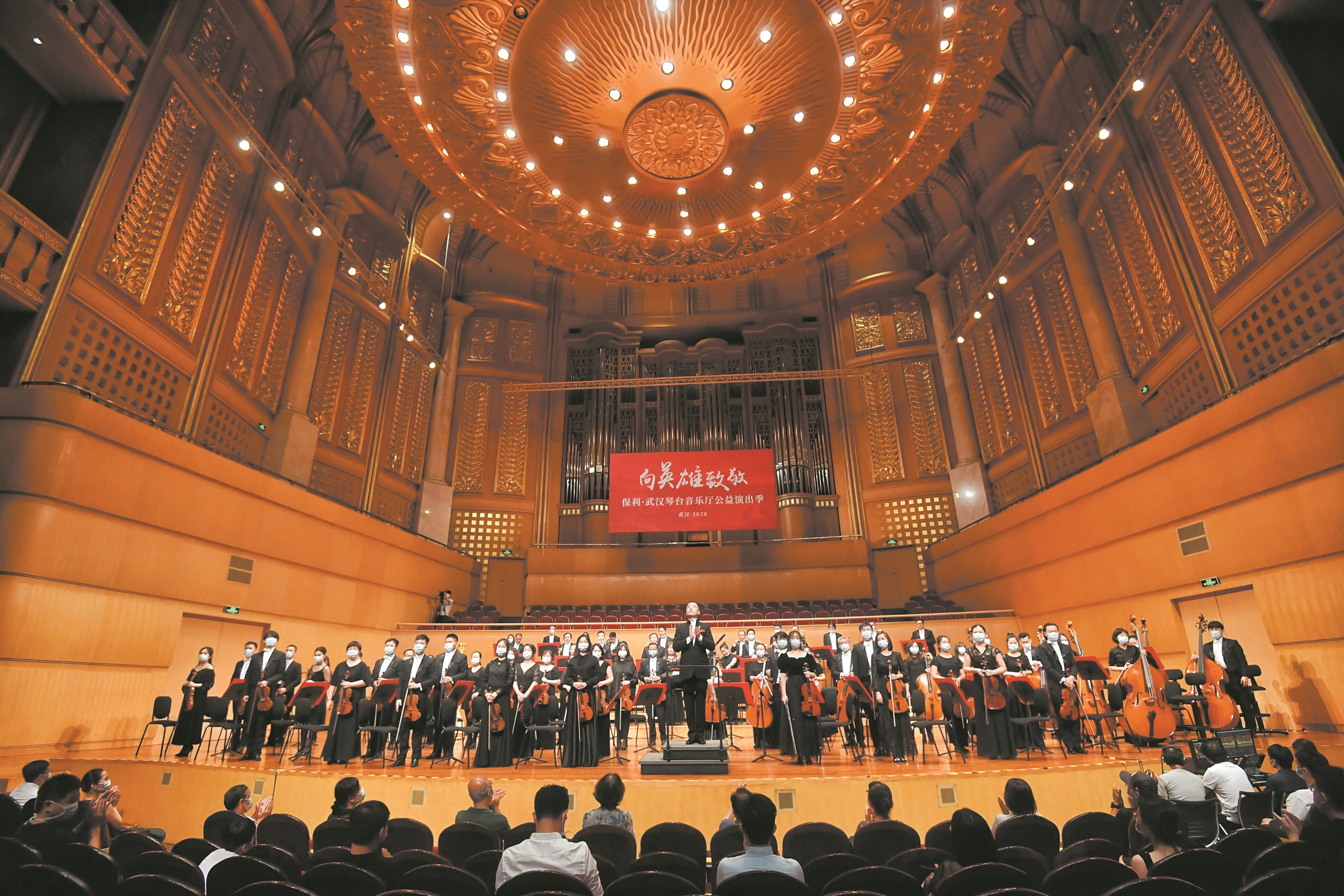 昨晚,时隔166天之后,琴台音乐厅金色大厅终于再次奏响琴声——武汉爱乐乐团70余位演奏员在指挥刘鹏的带领下,献上了音乐交响诗《我的祖国》中的《伏尔塔瓦河》和贝多芬《降E大调第三交响曲“英雄”,Op.55》的第1、4乐章,以期给每位观众和这座城市,带去前行的力量。