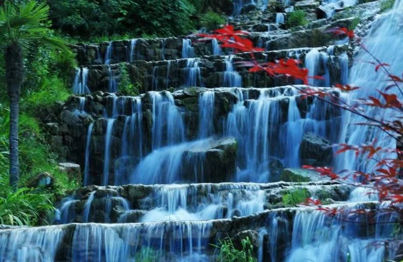 沿着月季园向下,就能听见瀑布群哗哗的水声。再走几步,眼前的山谷里便出现了一片白花花的水帘。