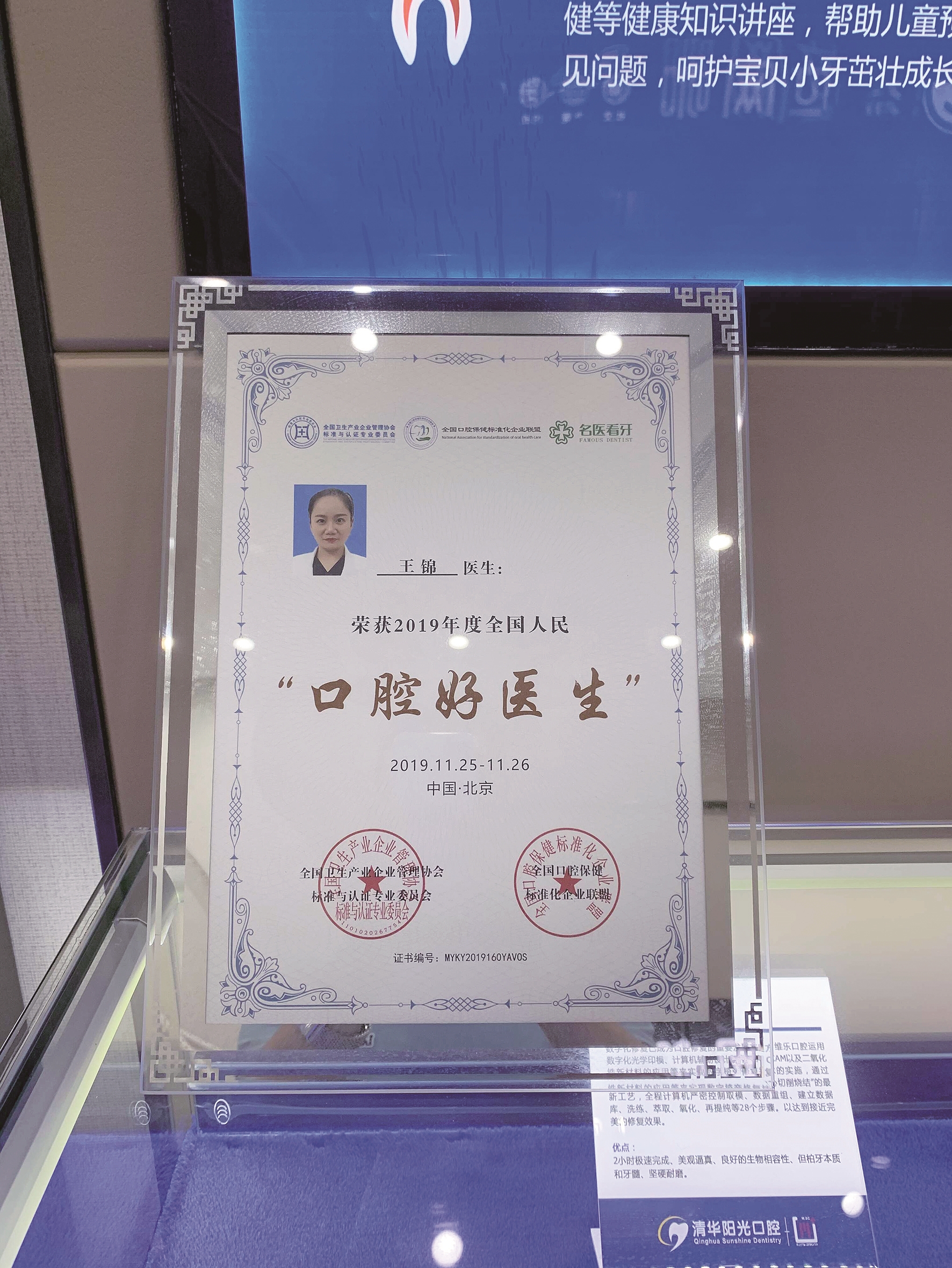 王锦跪地救人的消息传开后,武汉清华阳光口腔岳家嘴分院店长李新很快就在朋友圈里晒出了王锦所获“口腔好医生”的奖牌。这个奖牌平时摆放在医院前台大厅醒目处。