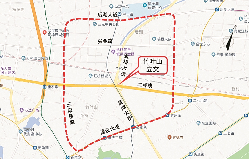 竹叶山立交是后湖、百步亭等片区居民通勤交通的重点通道,也是去往二七长江大桥、长江二桥、汉江大道等过境交通的重要节点,早高峰每小时流量接近1.6万辆,远超设计通行能力。其中,早高峰金桥大道由北向南去往竹叶山立交方向、二环线由东向西去往汉口火车站方向,拥堵最为突出。