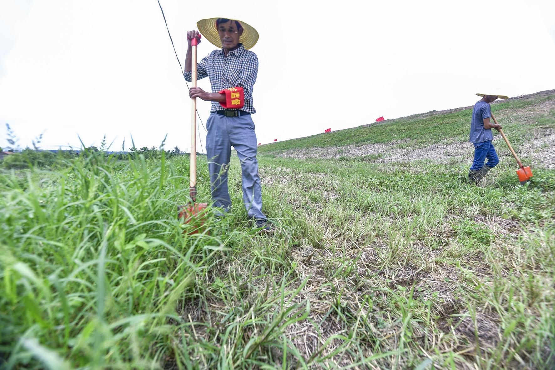 记者在河岸上看到,几名防汛人员头戴草帽,手拿铁锹或镰刀,沿着堤的背水面并排行走。他们边走边用铁锹扒拉地上的草,仔细查看堤防上是否存在隐患。