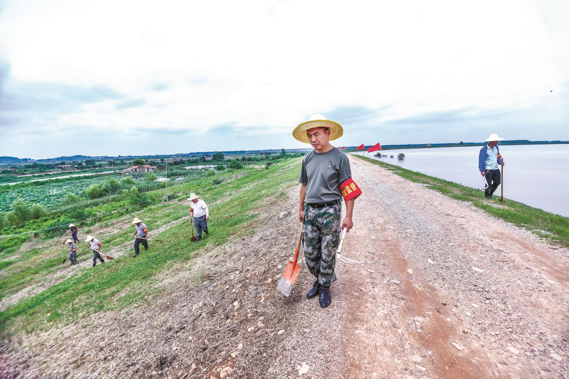 持铁锹镰刀排查堤上隐患