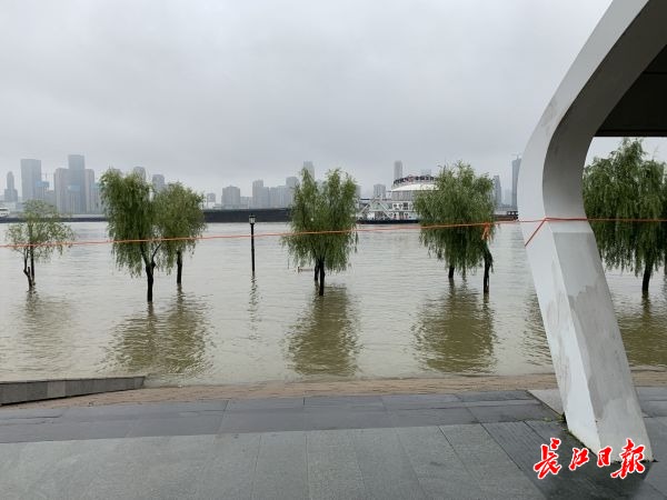 长江网7月5日讯(记者王怡人 通讯员向丽华)5日中午时分,雨水渐止。长江网记者从汉口江滩临江门进入,发现江水已漫过二级亲水平台,树木也被拦腰浸入江水中,不少市民兴致勃勃与江水合影。江滩办提醒:江水持续上涨,请游客一定要注意安全,不要下水游泳。