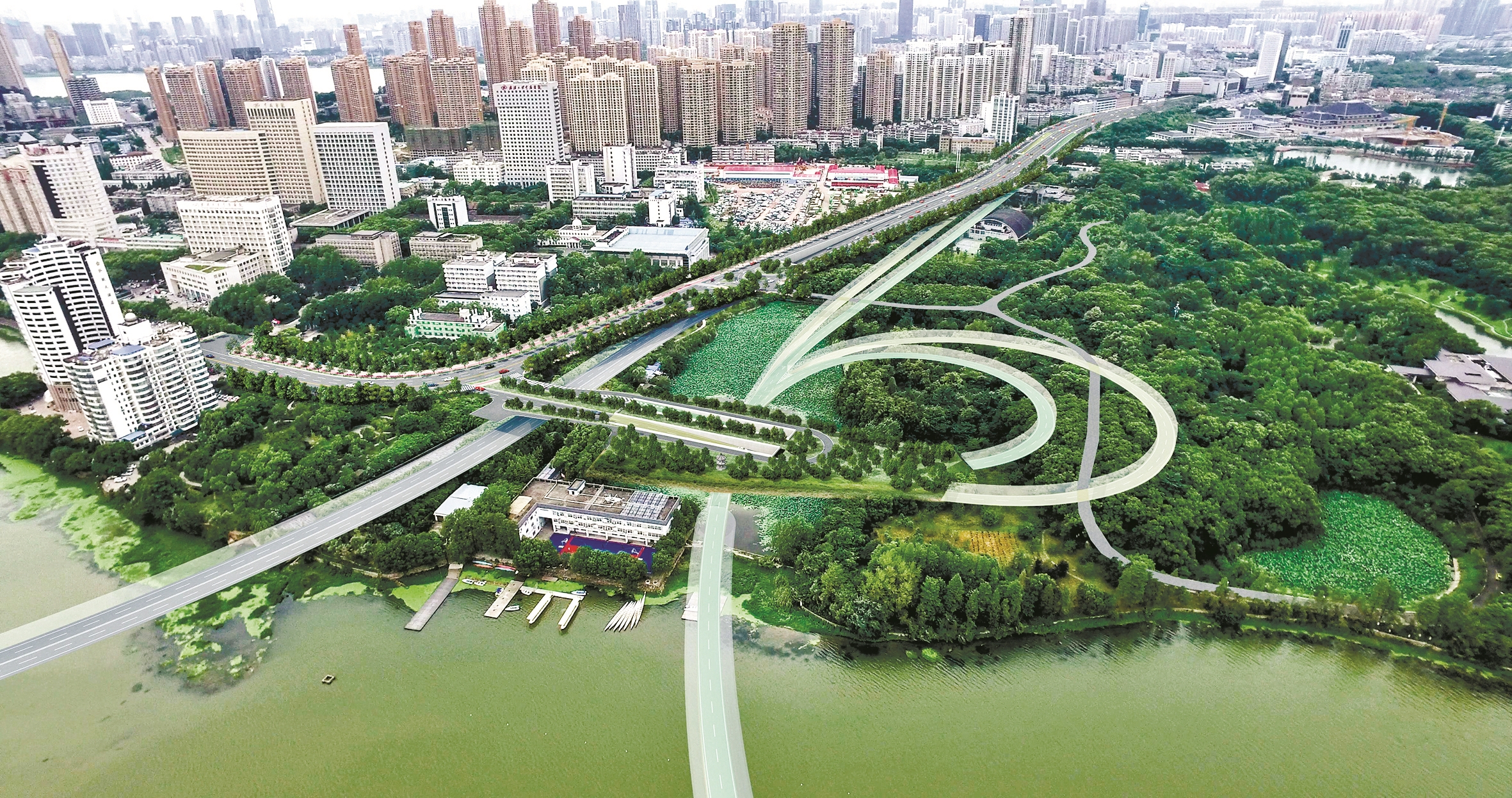 两湖隧道下穿三环线,三环线出入口设计为地下互通立交,与三环线的四个方向均可对接,经两湖隧道的车流可经三环出城,且预留了隧道向南延伸的条件,未来可延伸至汤逊湖江夏片区。