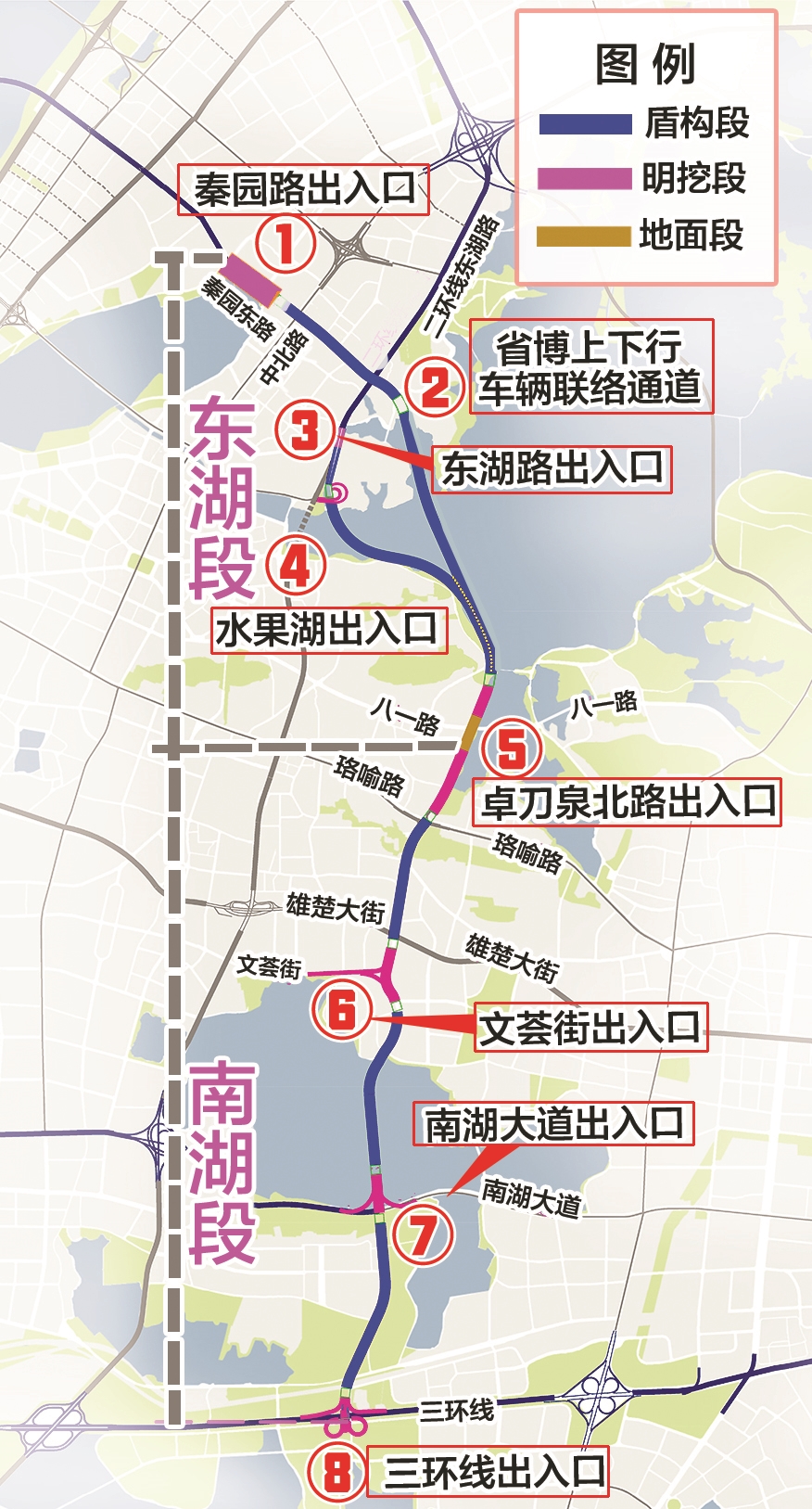 下穿东湖、南湖的武汉两湖隧道已于上月底正式开工,它的出入口如何设置,对沿线片区出行将带来怎样的利好,引来诸多市民关心。昨日,两湖隧道设计师对沿线出入口一一解读。