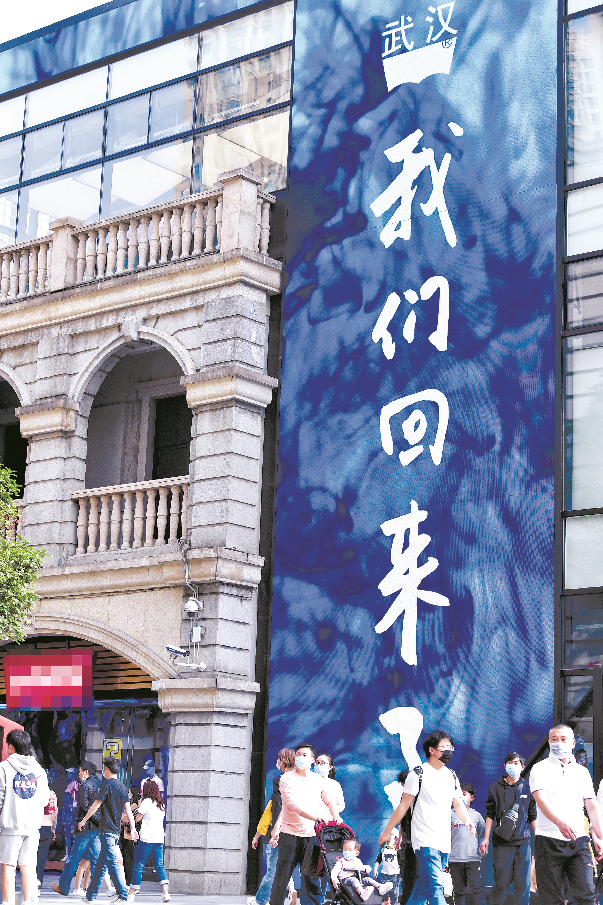 4月26日,武汉楚河汉街,“我们回来了”的巨型屏幕下,市民悠闲走过