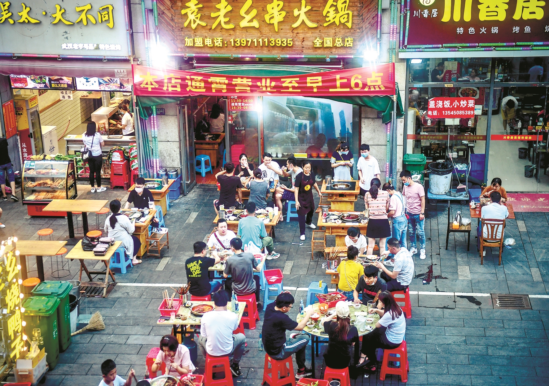 摆桌椅,支招牌,架炉灶……6月29日下午4时许,武汉市经开区万达金街上的袁老幺串火锅店就开始忙碌。晚7时,外摆灯箱和门头上的灯亮起来,撸串、吃虾、喝啤酒,店里店外50张桌台几乎满座。