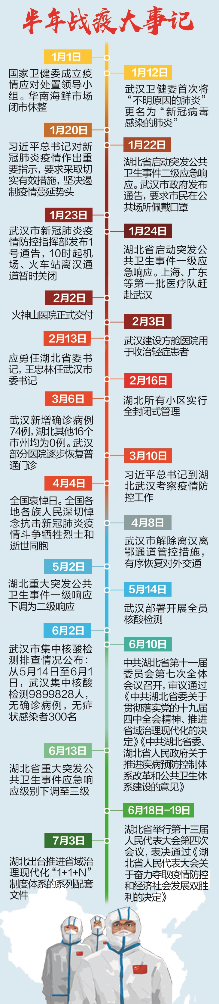 1月23日武汉“封城”,1月24日启动一级应急响应,3月25日解除离鄂通道管控,4月8日武汉解封,5月2日应急响应下调为二级,6月13日下调为三级……