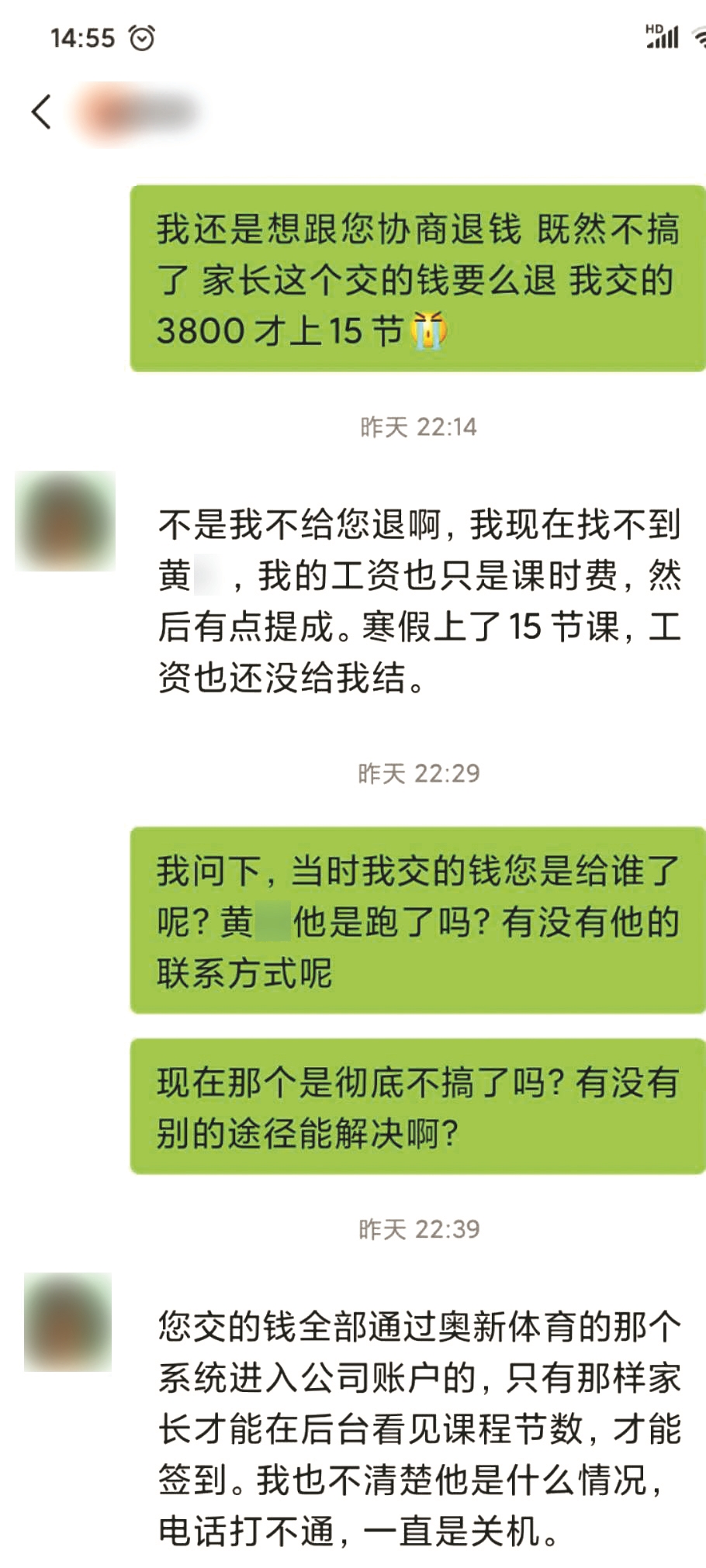 学生家长朱女士告诉楚天都市报记者,去年4月,她看到一个名为“奥新体育”的机构在开办篮球培训课。考虑到篮球是中考体育科目,孩子也喜欢打篮球,她就通过这个机构的微信报了名,并加入俱乐部微信群。学费3900元,上104节培训课。一直到去年底,孩子上了42节课。疫情过后,“奥新体育”一直没有恢复培训。群里的300多名家长都在讨论复课的事情,没想到,群主突然将微信群解散了。